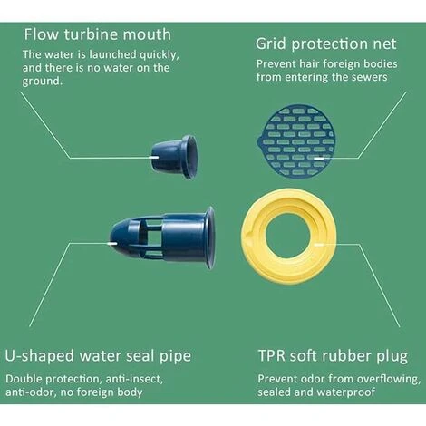 [+] Le siphon de sol de la douche est fabriqué en matériau ABS + TPR de haute qualité, ce qui est sûr et durable, non toxique et sans goût [+] Le nouveau siphon de sol désodorisant à 360° est différent des siphons de sol traditionnels du marché, il est composé d’une variété de structures et possède de riches fonctions</ p > [+] Conversion du drainage gravitaire en force centrifuge, drainage à 360 degrés, entrée d’eau facile, sortie d’eau difficile, sortie d’eau rapide, pas d’accumulation d’eau au fond>