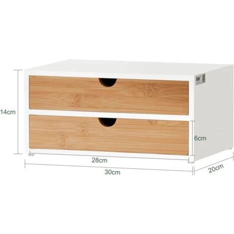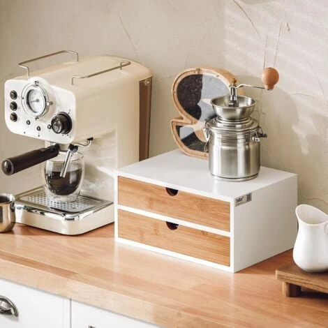 SoBuy® FRG180-WN Boîte de rangement à 2 tiroirs Porte-Capsules Nespresso Distributeur Boîte à Capsules de Café Cette boîte avec 2 tiroirs fermés est optimale pour le stockage des capsules de café ou sachets de thé. Rangement idéal pour des capsules de café Nespresso et thé préférées ! Elle s’installe directement sous votre machine pour un gain de place optimal. Avec cette boîte, vous économiserez de l’espace. Cette boîte est également idéale pour le bureau. Vous pouvez l’utiliser comme un organisateur de bureau. L’organisateur est adapté pour le stockage des stylos, ciseaux, ouvre-lettres et d’autres accessoires de bureau. Détails : – Fabriqué en Bois MDF et bambou écologique, solide et durable. – Dimensions de la Boîte : L30cmxP20cmxH14cm. – Tiroirs intérieurs: L26cmxP17cmxH4.5cm. – Pas compatible avec des dosettes Dolce Gusto! – Poids de l’envoi : 3,2kg. Cet article est livré sans éléments décoratifs des photos.