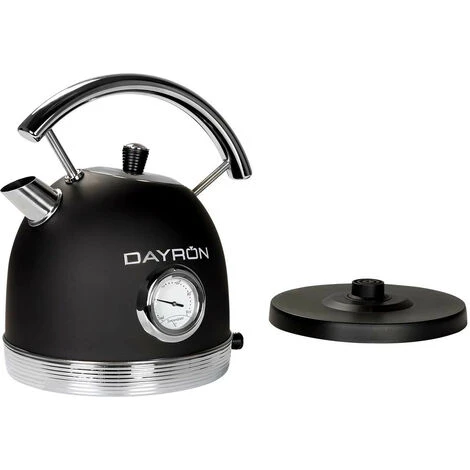 Bouilloire rétro 1850-2200W de Dayron, donnez une touche vintage à votre cuisine. Particulièrement adaptée à un usage domestique. Grâce à sa puissance élevée (maximum 2200W), vous pourrez faire bouillir de l’eau très rapidement et facilement. Son élégant thermomètre analogique vous indiquera les degrés d’ébullition et son arrêt automatique arrêtera toujours la bouilloire à temps. Température de fonctionnement de 100º. Cette bouilloire est fabriquée en acier inoxydable. Elle est solide et durable pour une utilisation quotidienne dans la cuisine. Sa poignée ergonomique cool-touch vous protège de la chaleur et des brûlures. Son récipient d’une capacité de 1,75 litre vous permet de ne jamais être à court d’eau lorsque vous recevez de la visite à la maison pour l’heure du thé. Elle est équipée d’un bec verseur de précision, d’une protection contre la marche à sec et d’indicateurs de fonctionnement et de niveau d’eau. Son design rétro et attrayant sera du plus bel effet dans votre cuisine. Produit sans BPA. Très facile à nettoyer, son filtre est amovible. Faites-vous plaisir et emportez chez vous une bouilloire tendance. *Veuillez noter que les images, les mesures et les couleurs de certains de nos produits sont des données approximatives. Les écrans peuvent parfois présenter de légères variations d’affichage dues au calibrage, à l’angle, à la lumière et à d’autres facteurs.