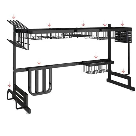 1. Fonction polyvalente : l’égouttoir de cuisine peut stocker de la vaisselle de différentes tailles, y compris des plats, des bols, des couteaux, des planches à découper et des couvercles de casseroles, du détergent, des baguettes, des cuillères et des fourchettes, des fruits et légumes, etc.