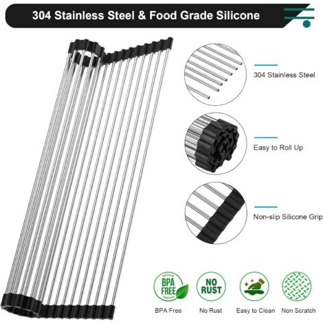 « [Matériau de qualité alimentaire] – Le séchoir enroulable est composé de tubes en acier inoxydable 304 et de silicone alimentaire, sain et respectueux de l’environnement, totalement sans BPA, sûr et fiable. Facile à nettoyer, passe au lave-vaisselle.