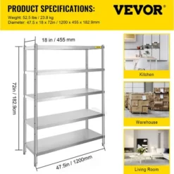 VEVOR Etagere De Cuisine Professionnelle Inox 5 Tablettes 122x47x183 Cm 750kg