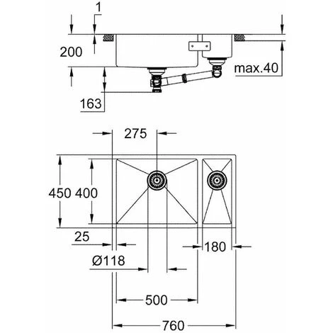 Évier de cuisine en inox K700U 80-S 76/45, petit bac à droite