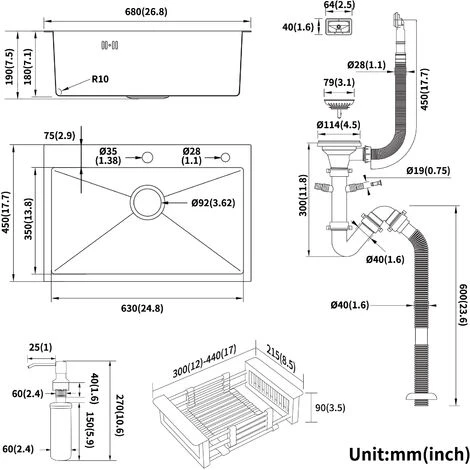 - TIPS: 1)S’il vous plaît confirmer la taille du produit lors de la commande. La taille du produit est de 68×45×19cm, et le bac d’évier est 63×35×18.5cm.