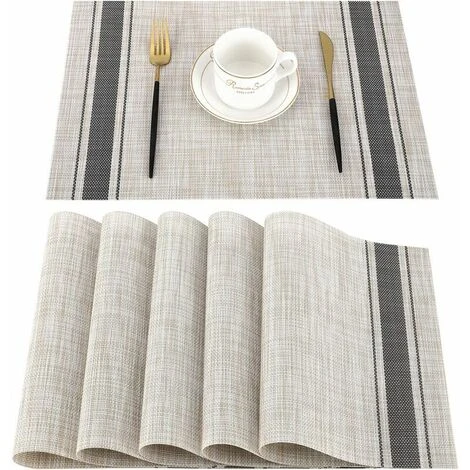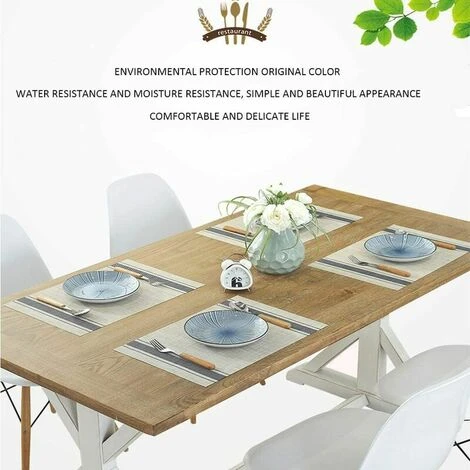 Taille du set de table : 17,7 x 11,8 (45 cm x 30 cm) Colis – Lot de 6 sets de table en plastique. Caractéristique : résistant à la chaleur, aux taches, antidérapant, lavable, lavable et durable. Sets de table en PVC de haute qualité : ces sets de table en PVC lavables ont été approuvés par la FDA comme accessoires de cuisine respectueux de l’environnement, sûrs et non toxiques, sans BPA, sans odeur particulière, sans danger pour notre santé. Set de table antidérapant et résistant à la chaleur : les sets de table tissés double face sont antidérapants et résistants à la chaleur. L’isolation efficace de ces sets de table peut atteindre jusqu’à 80 °C, protéger la table sans rayures ni taches et créer un environnement propre et confortable. Facile à nettoyer et à entretenir : lorsque le set de table est sale, utilisez simplement un chiffon humide pour essuyer la saleté, ou lavez sous l’eau courante et séchez à l’ombre. Ces sets de table sèchent rapidement, ne se décolorent pas, antibactériens, anti-moisissure, faciles à ranger, peuvent être enroulés pour économiser de l’espace. Multifonctionnel : Ces sets de table en vinyle permettent de protéger et décorer votre table (verre, bois, métal), adaptés à toutes les occasions. Parfait pour la cuisine, l’hôtel ou le bureau, les restaurants ou les cafés, les activités de plein air, les vacances, les fêtes à la maison, les réunions de famille, etc. sets de table. – Le set de table thermo-isolant et antidérapant permet de poser le bol 80°C sur la table sans l’abîmer. – Facile à nettoyer : il suffit d’essuyer ces sets de table tissés avec un chiffon humide ou de les laver sous l’eau courante pendant quelques secondes et de les sécher rapidement. – Facile à ranger : peut réduire vos travaux de nettoyage, rendre votre travail ménager plus efficace, et les sets de table en vinyle sont également faciles à ranger, peuvent être enroulés et économiser de l’espace – Décoration : complément parfait à votre table à manger, se marie bien avec un bois foncé table, une table en verre, une table à manger blanche, une table de ferme en bois, une table à manger marron. – Utilisation : Idéal pour les vacances, les pique-niques, les fêtes, les barbecues, les réunions, les dîners, la décoration de cuisine, etc. Napperons en vinyle Remarque : 1. Si vous avez le problème des plis, faites-le tremper dans de l’eau tiède, sortez-le et placez un objet lourd dessus. Le pli disparaît. 2. Veuillez utiliser de l’eau chaude et du détergent pour essuyer les taches avec un chiffon, puis rincer à l’eau et sécher à l’ombre. Ne pas laver avec des objets durs tels que des billes d’acier. 3. Ce set de table ne doit pas être mis au micro-ondes ou au lave-vaisselle.