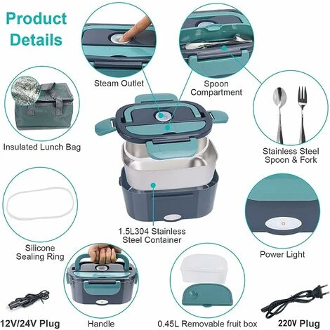 [Petite et portable] — La gamelle chauffante portable contient une lunch box intérieure amovible en acier inoxydable de 1,5 L et une lunch box en plastique de 0,45 L, utilisée pour séparer différents types d’aliments. Équipé de cuillères et fourchettes en acier inoxydable, un petit compartiment est intégré dans la lunch box, qui peut être utilisé pour ranger les ustensiles. Conception de poignée anti-brûlure. Comprend un sac de transport isolé.