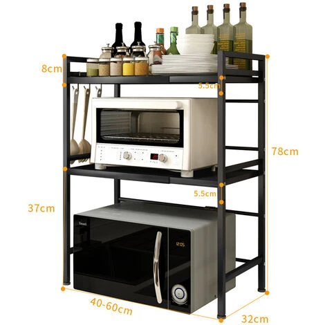- Construit en acier au carbone et peut supporter jusqu’à 110 lb (50 kg). Il est suffisamment solide pour ranger un four à micro-ondes et d’autres articles de cuisine, tels que des bouteilles, des pots, des plats, des casseroles, des casseroles, etc.