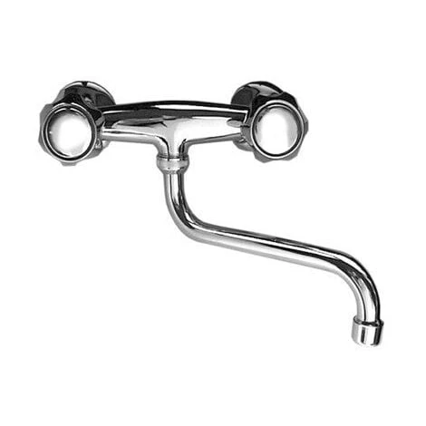 ROBINET MURAL COMPLET Robinet mural avec bec pivotant. Robinet à deux poignées en laiton chromé avec bec pivotant. Cet article est idéal pour les buanderies car le bec verseur est entièrement pivotant et est très pratique. Il est entièrement fabriqué en laiton chromé lourd et permet une utilisation quotidienne. Il est livré complet avec tout ce qu’il faut pour être installé.