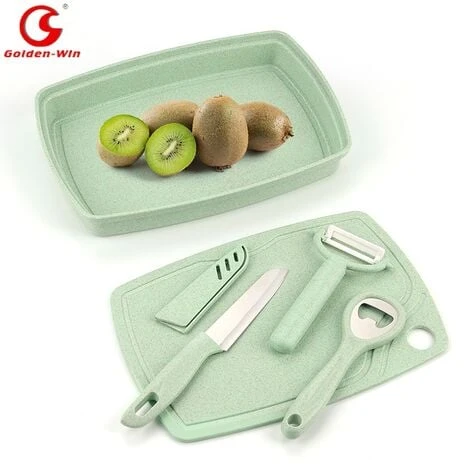 Planche à découper : Fabriqué à partir de paille de blé écologique de qualité alimentaire par un procédé de presse à chaud. La planche à découper est conçue avec une rainure pour liquides sur le bord pour empêcher les liquides de couler vers le comptoir, ce qui réduit les problèmes de nettoyage ! Notre planche à découper et notre ensemble de couteaux passent au lave-vaisselle. Contrairement aux autres planches à découper en bois et planches à découper en bambou, notre planche à découper ne moisira pas.