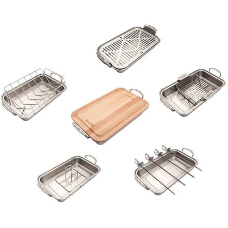 Le système Grill+ vous permet de créer une multitude de plats délicieux. Vous pouvez utiliser ce plat à rôtir seul ou combiné à l’un des accessoires Grill+ pour multiplier vos idées de recettes• Plat 22 x 36 cm en acier inoxydable, utilisable au barbecue ou au four• Planche à découper multifonctions, servant aussi de couvercle pour vos préparations et la conservation de vos plats• Plat à rôtir-passe au lave-vaisselle