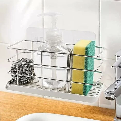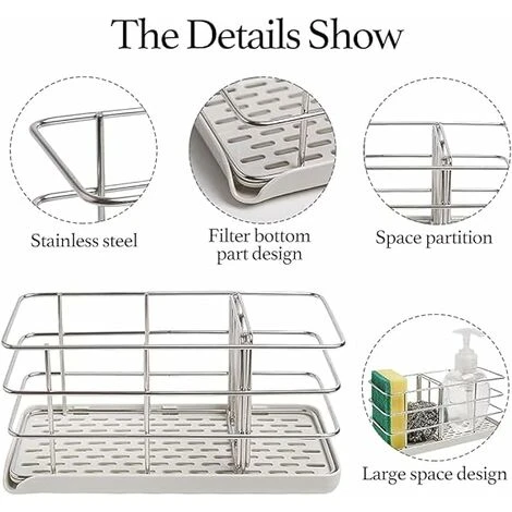 Porte-éponge peu encombrant pour évier : le porte-éponge de cuisine aide à organiser et à sécher les éponges, le torchon et le distributeur de savon, les brosses, le bouchon d’évier. L’élégant organisateur d’évier de cuisine polyvalent est une solution de rangement parfaite pour garder votre évier de cuisine, votre vanité de salle de bain, votre comptoir et votre baignoire propres et organisés avec facilité. Idéal pour l’utiliser dans la cuisine, les salles de bain et partout où vous en avez besoin.
