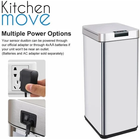 - Corps en INOX (0.4mm) et couvercle en ABS. Fonctionne avec 4 piles LR06 (non fournies). Possibilité de brancher le produit sur une prise secteur (en achetant l’adaptateur en option) Inclus: Un cerclage plastique pour maintenir votre sac poubelle, et un anneau au sol pour la protection des sols fragiles.