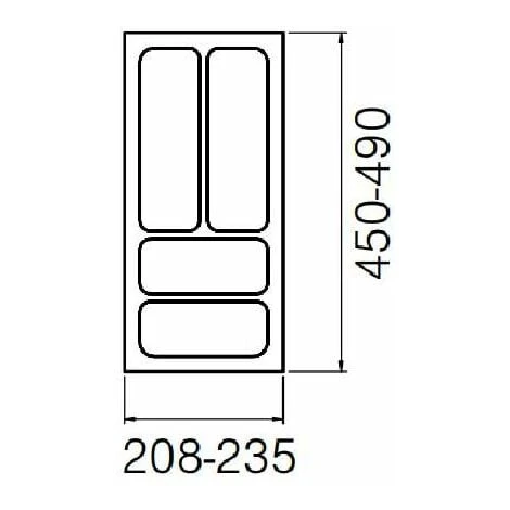 Range couverts ; Pour intérieur de tiroir ; Matière = Plastique ; Couleur = Blanc ; Dimension = 235 x 490mm (Possibilité de recouper pour 208 x 450mm) ; 4 compartiments