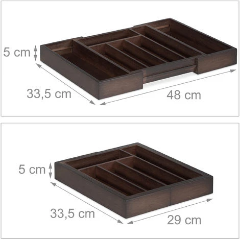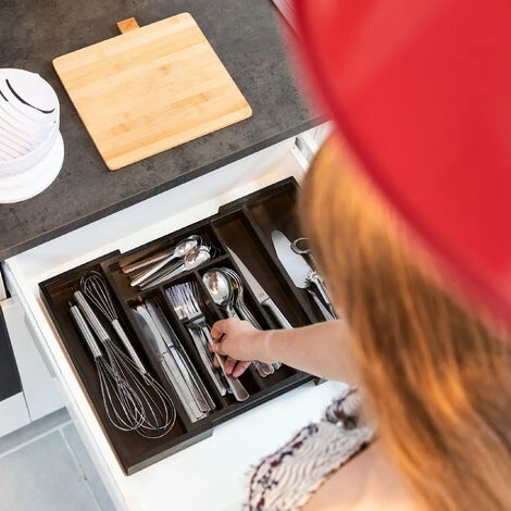 L’écrin à couverts en bambou peut être réglé individuellement sur la largeur grâce aux deux compartiments latéraux modulables. Ainsi il se confine dans les tiroirs usuels. Dans sa largeur minimale, le bac à couverts dispose de 5 compartiments longs avec assez de place pour les couteaux, fourchettes, cuillères et ustensiles de cuisine. Si vous tirez les parties latérales, vous pouvez alors utiliser deux casiers supplémentaires pour les autres accessoires de cuisine comme le fouet, la spatule et bien plus. La boîte de tiroir modulable est un matériel de cuisine optimal pour ranger et trier.
