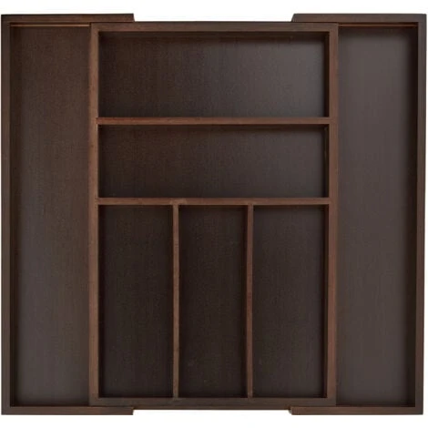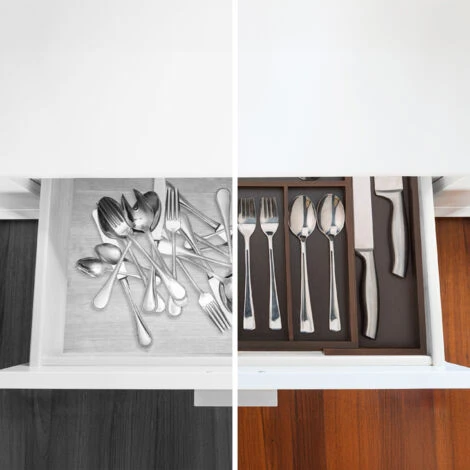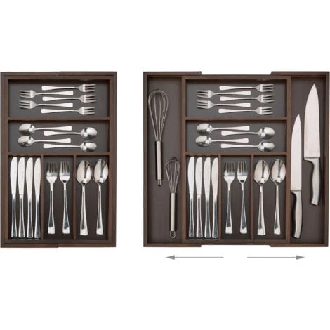 L’écrin à couverts en bambou peut être réglé individuellement sur la largeur grâce aux deux compartiments latéraux modulables. Ainsi il se confine dans les tiroirs usuels. Dans sa largeur minimale, le bac à couverts dispose de 5 compartiments longs avec assez de place pour les couteaux, fourchettes, cuillères et ustensiles de cuisine. Si vous tirez les parties latérales, vous pouvez alors utiliser deux casiers supplémentaires pour les autres accessoires de cuisine comme le fouet, les spatules et bien plus. La boîte de tiroir modulable est un matériel de cuisine optimal pour ranger et trier.