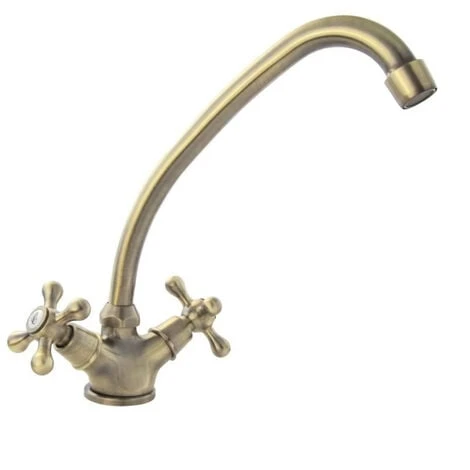 Robinet de cuisine – Mélangeur évier – Style rétro – Mécanisme : tete céramique 1/4 tour – Économie d’eau : aérateur réducteur de débit – Poignée : métal – Corps : laiton – Bec : tube mobile – Embase : Ø 52 mm – Flexibles de raccordement en inox F 3/8 – Vieux bronze – Garantie 5 ans
