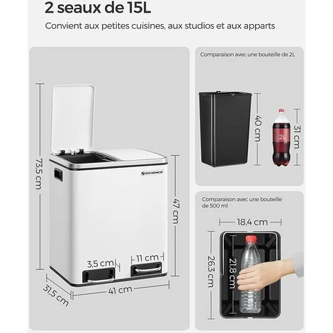 Poubelle de tri sélectif pour les petites familles : C’est facile de jeter des déchets dans les petits espaces avec cette double poubelle SONGMICS. Les 2 compartiments de 15L vous permettent de trier les déchets recyclables et non-recyclables, sans encombrer la pièce.