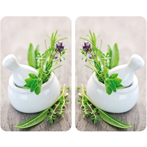 - Étendue de la livraison : 2x protège-plaques de cuisson en verre trempé, motifs herbes, pieds en matière plastique en gris clair, dimensions (L x h x l) : 30 x 1,8-4,5 x 52 cm chaque